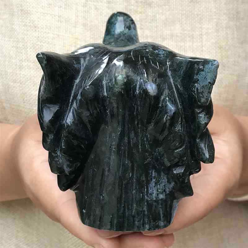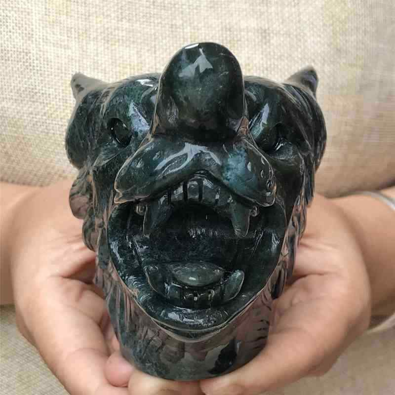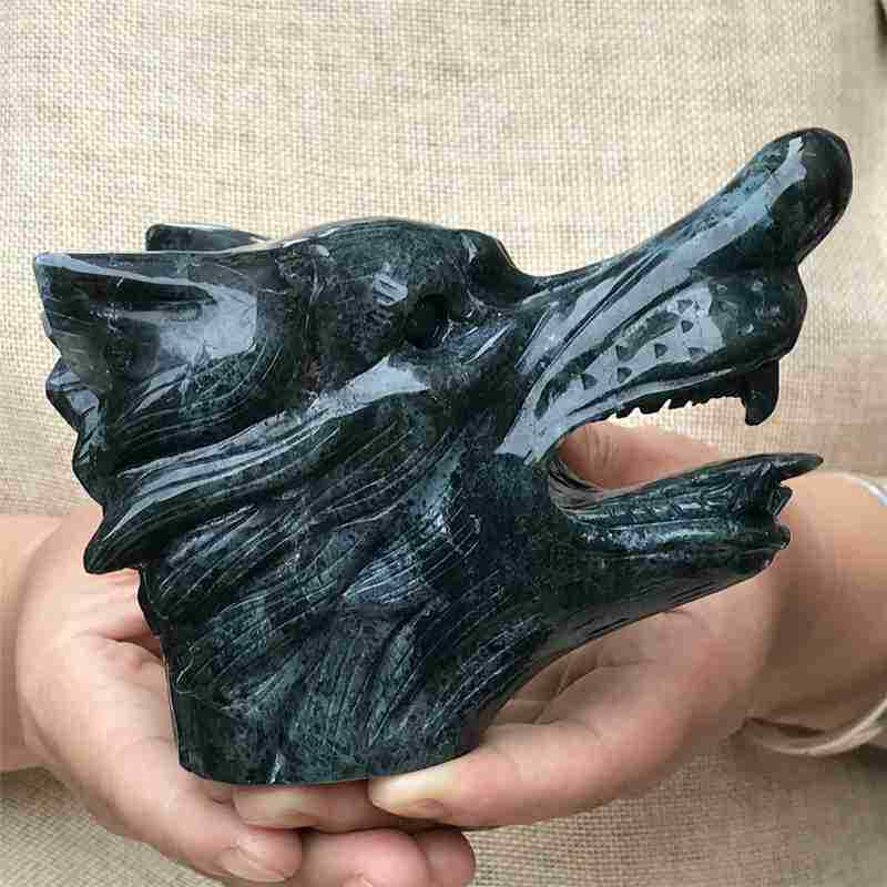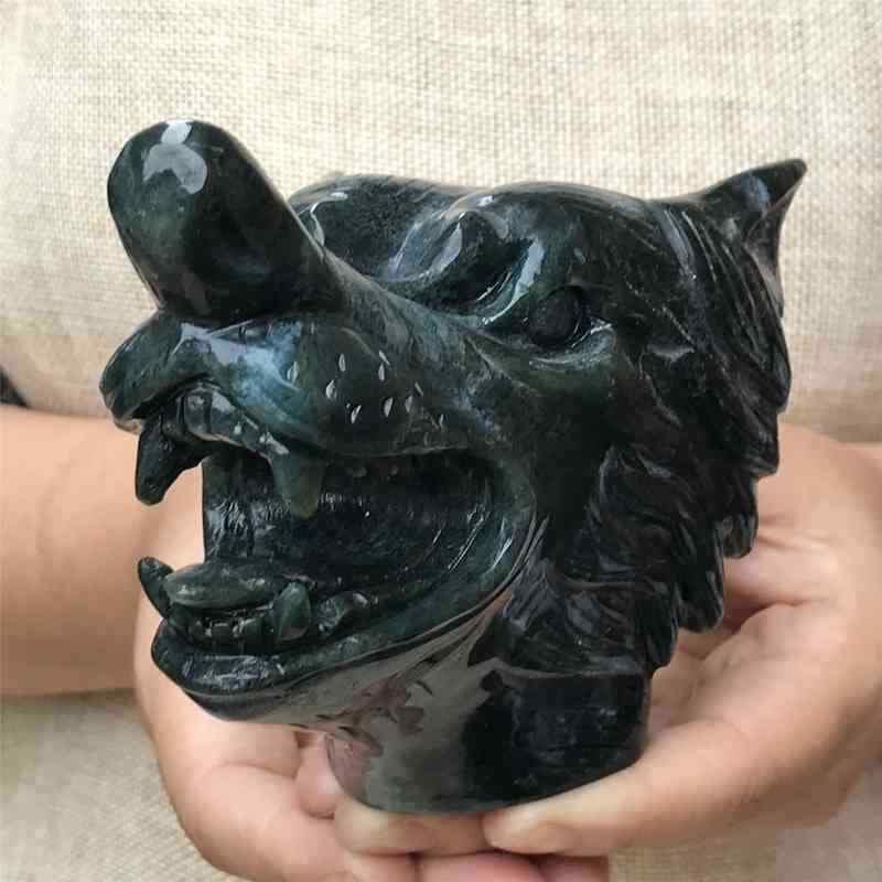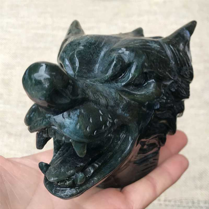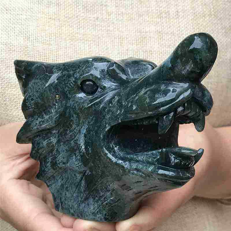 0.77kg Natural moss agate Wolf skull carved Quartz Crystal skull Healing