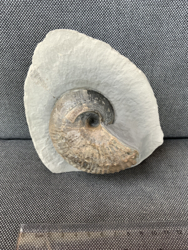 Specimen measures approx 12.5cm x 12.7cm x 7cm, with the ammonite approx 8.6cm in diameter.