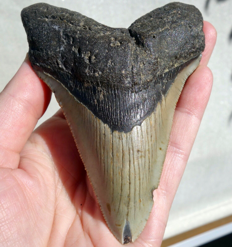 MEGALODON SHARK SERRATED TOOTH ~ 4.17" ~ SHARK TEETH ~ REAL FOSSIL