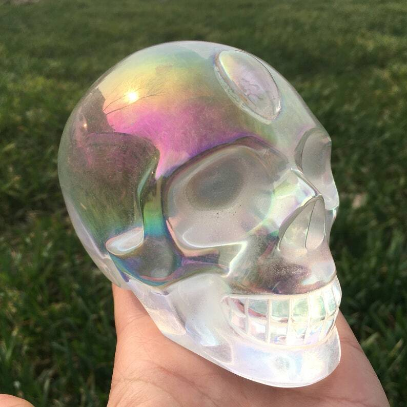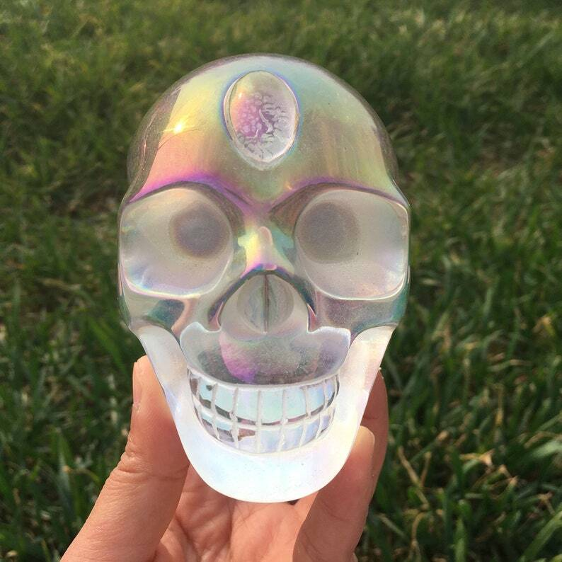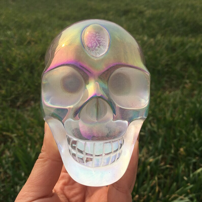 Rainbow Titanium Aura Clear Melting Stone Skull Reiki Heal Crystal sculpture