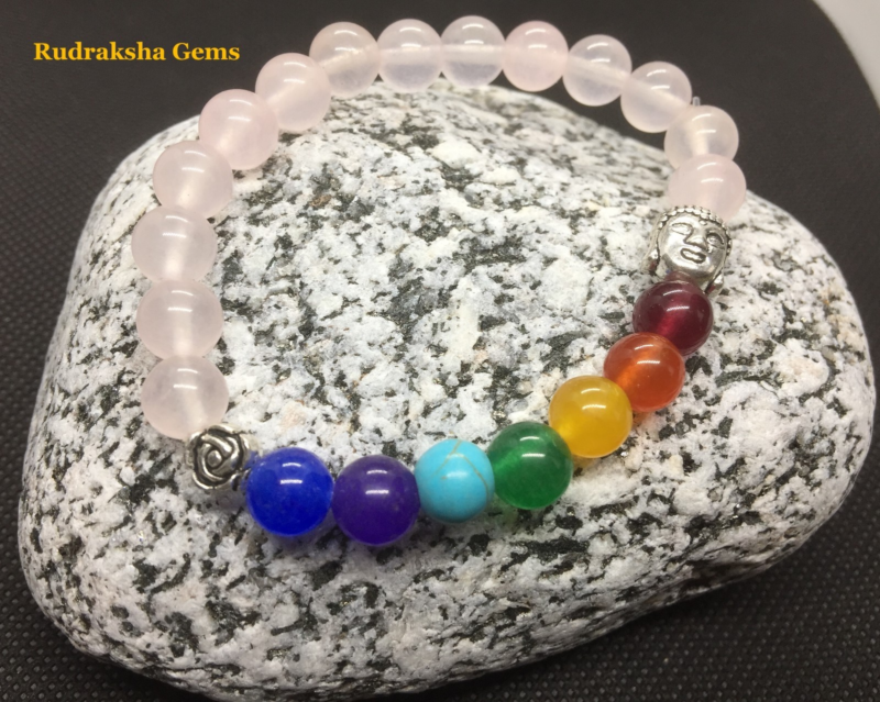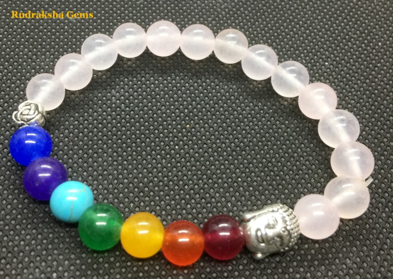 This bracelet has 7 Crystal beads stones For 7 Chakra's with 14 Rose Quartz beads, Rose metal spacers and Buddha.