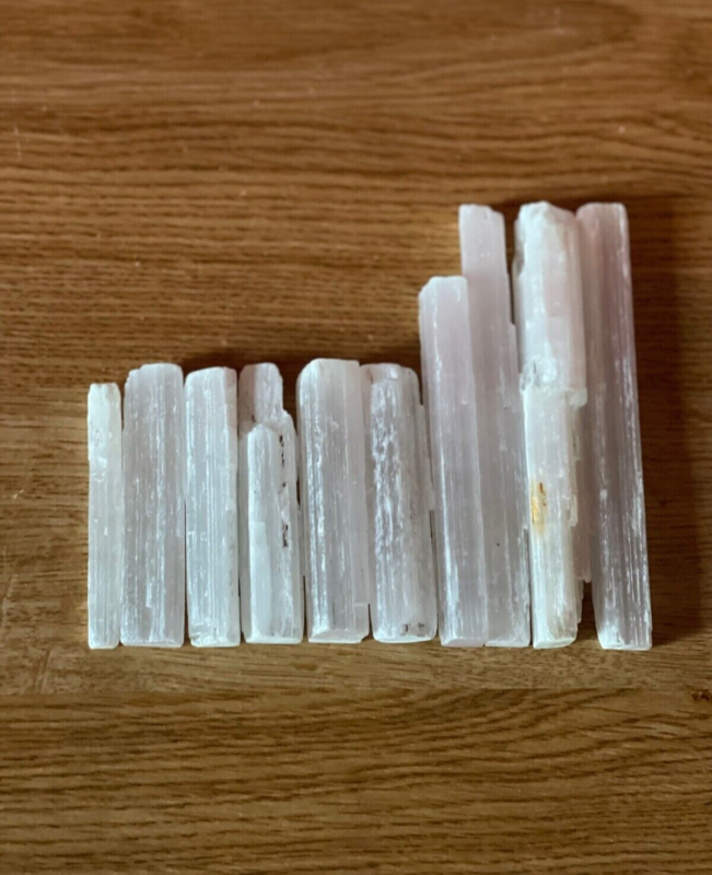 10 Selenite Crystal Wands of varying sizes, these translucent crystal wands are a form of the mineral gypsum.