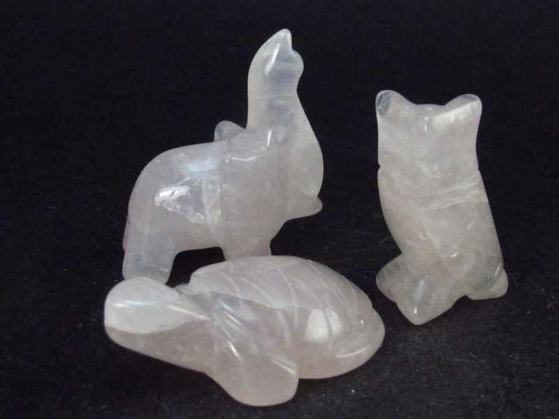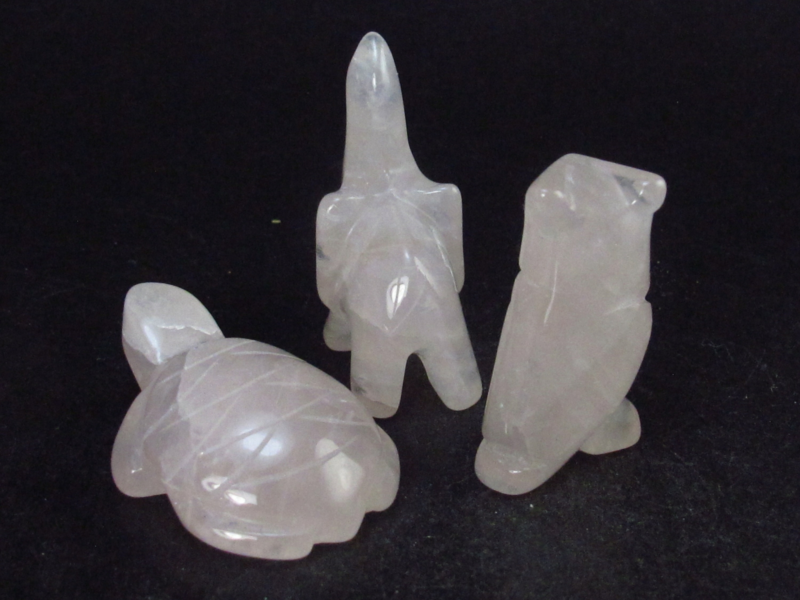 Set of 3 Natural Rose Quartz Carved Owl, turtle and elephant.