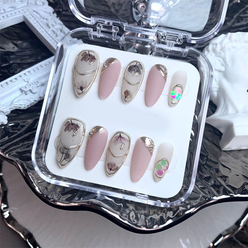 10PCS Handmade Fake Nail Dream Flowers Short Almond Press on Nails for Nail Art