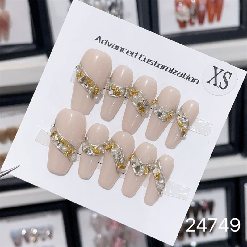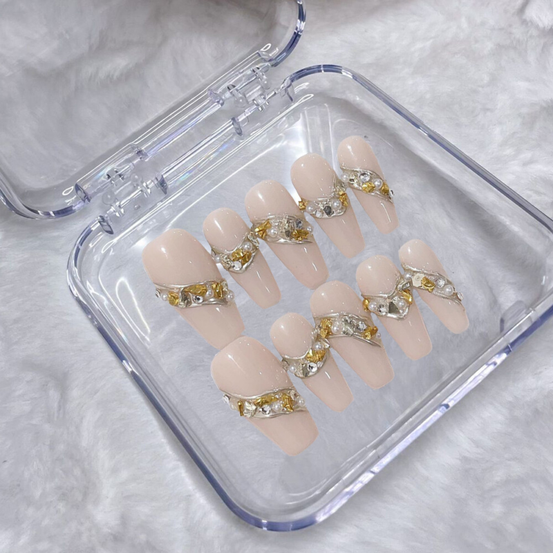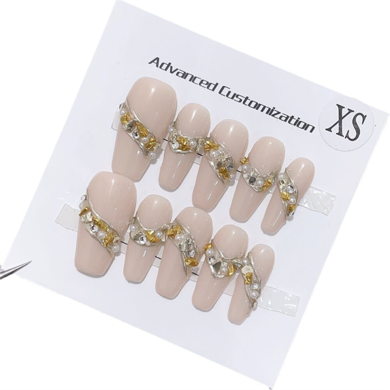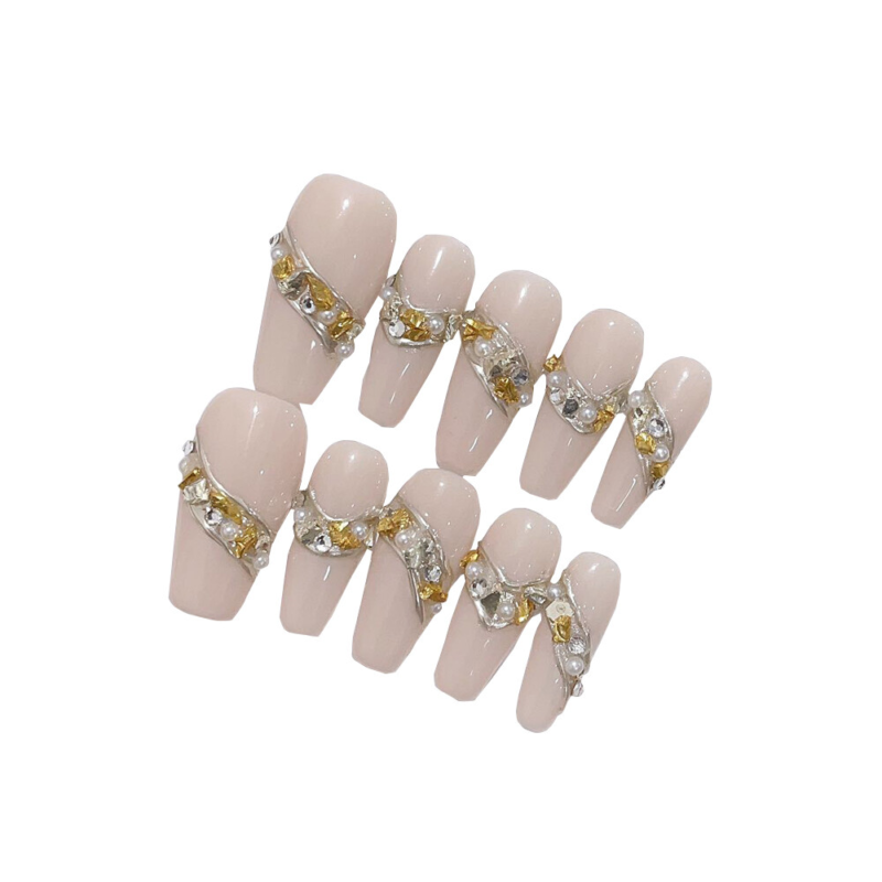 10PCS Handmade Fake Nail Nude Color Sparkling Coffin Press on Nails for Nail Art
