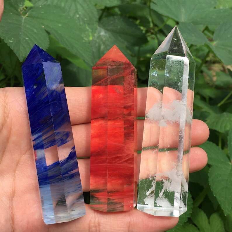 3PC Red+Blue+Clear Melting Stone Obelisk Quartz Crystal Wand Point Decoration