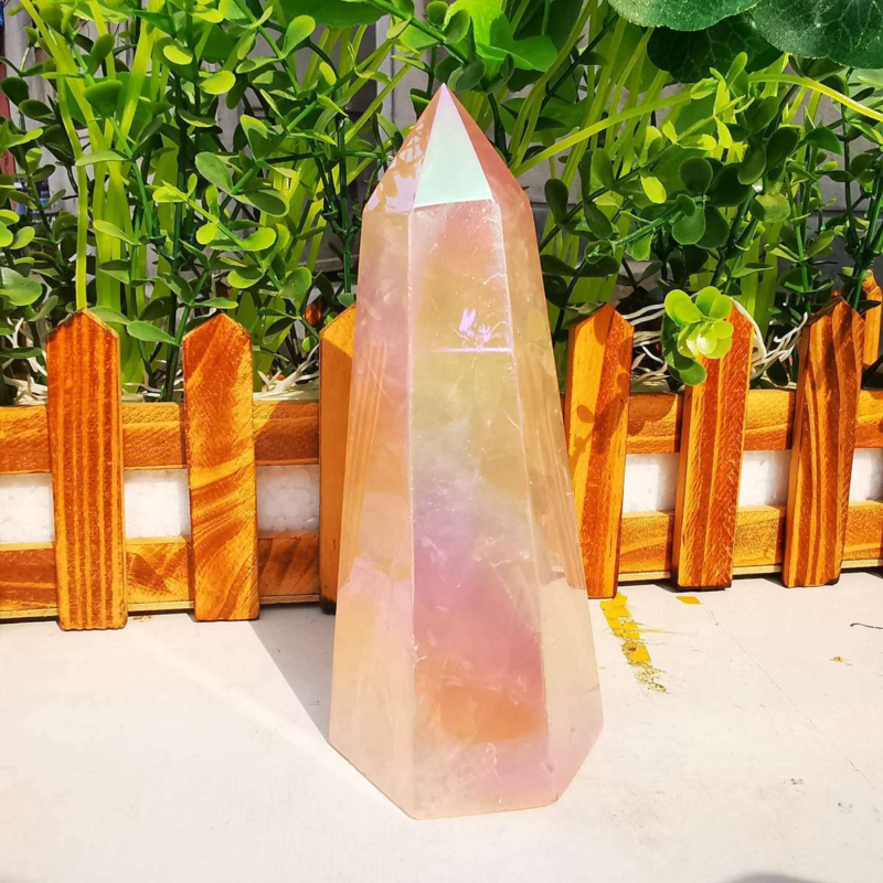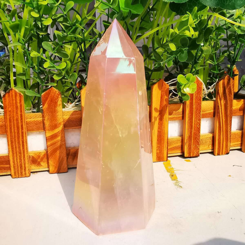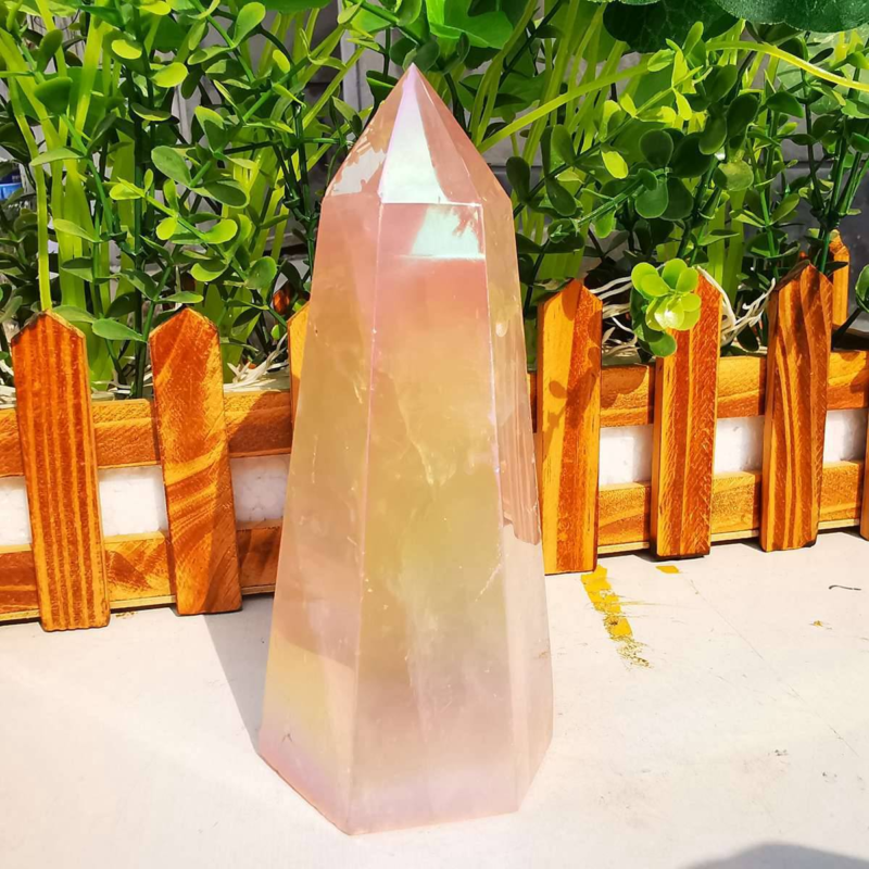 535g electroplated natural pink rose quartz obelisk rainbow crystal point reiki
