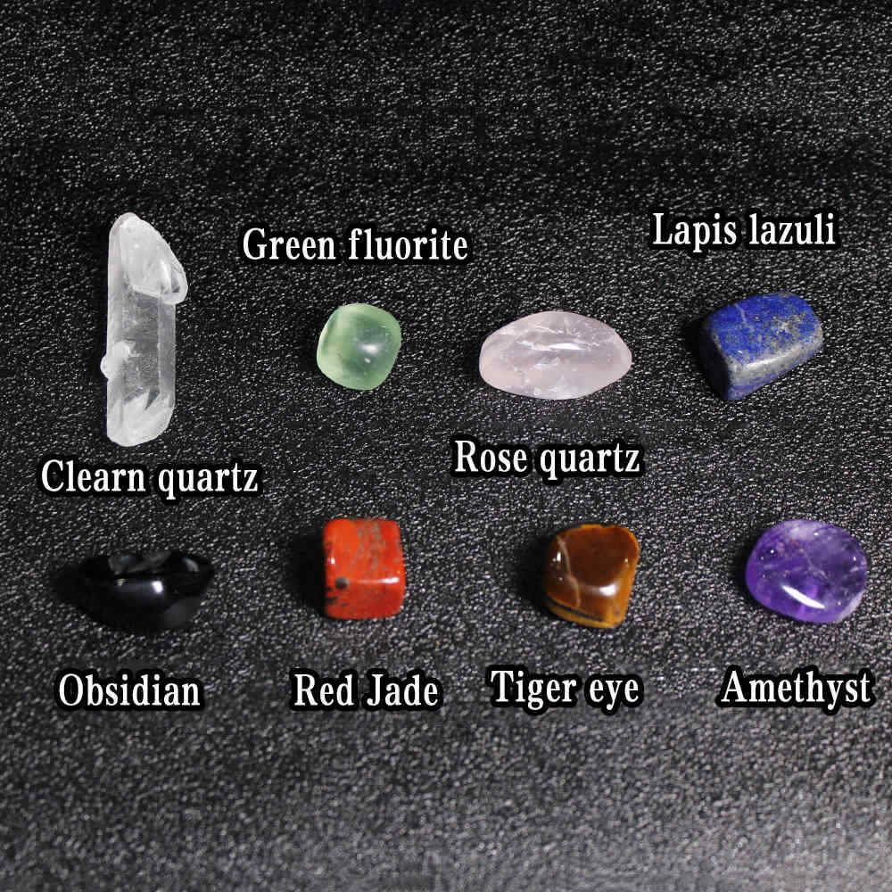 -Crystal Type:Red jade stone,tiger eye stone,amethyst stone,obsidian stone,rose quartz stone,lapis lazuli stone,green fluorite stone,clear quartz wand