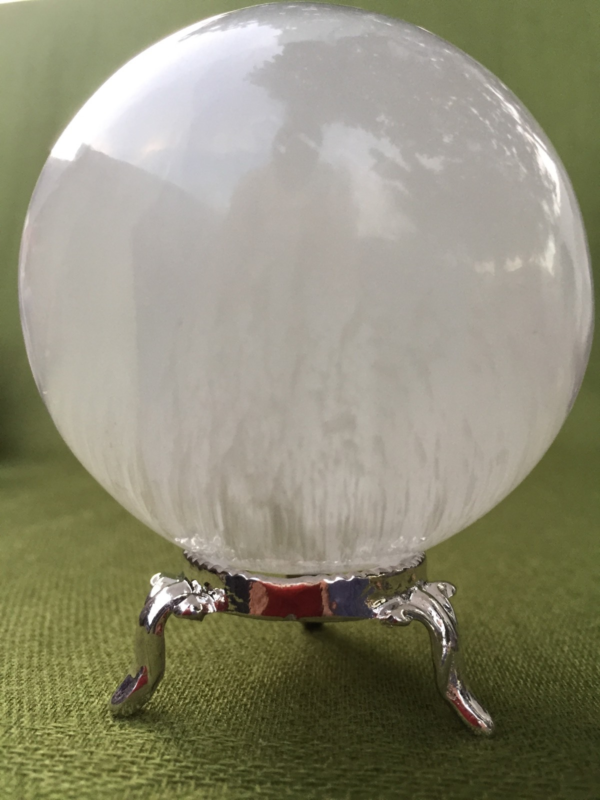Beautiful, polished, natural white Selenite sphere with stand.