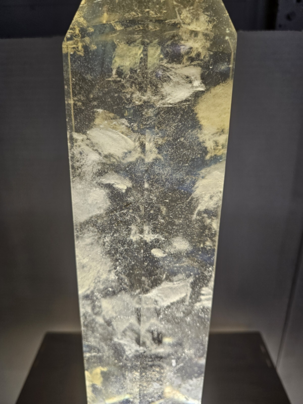 This stunning crystal tower has a unique yellow hue and has undergone a special modification process using smelted melting stone. It measures a massive 15 inches and weighs in at 8.9 pounds. The crystal is shaped like a generator and is perfect for meditation or healing purposes. It was crafted in China by Art Crystal Products and has been modified to enhance its natural beauty.