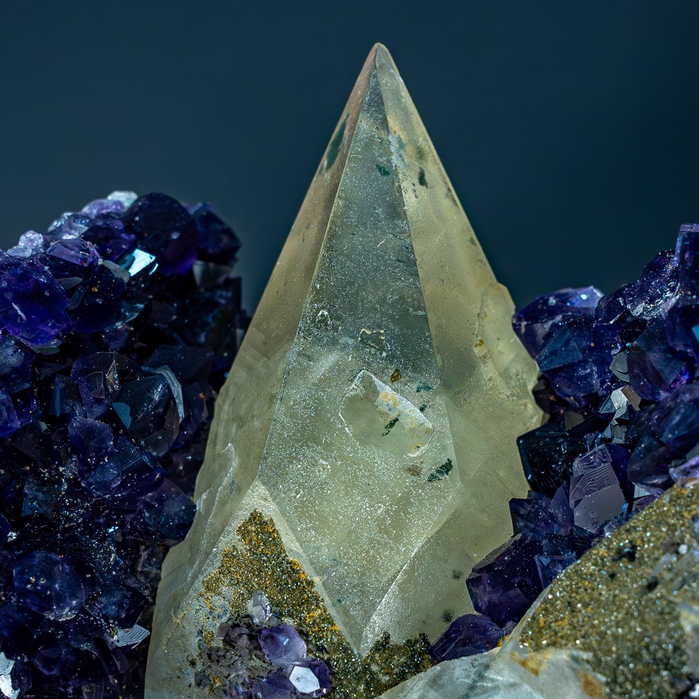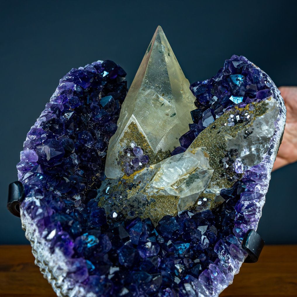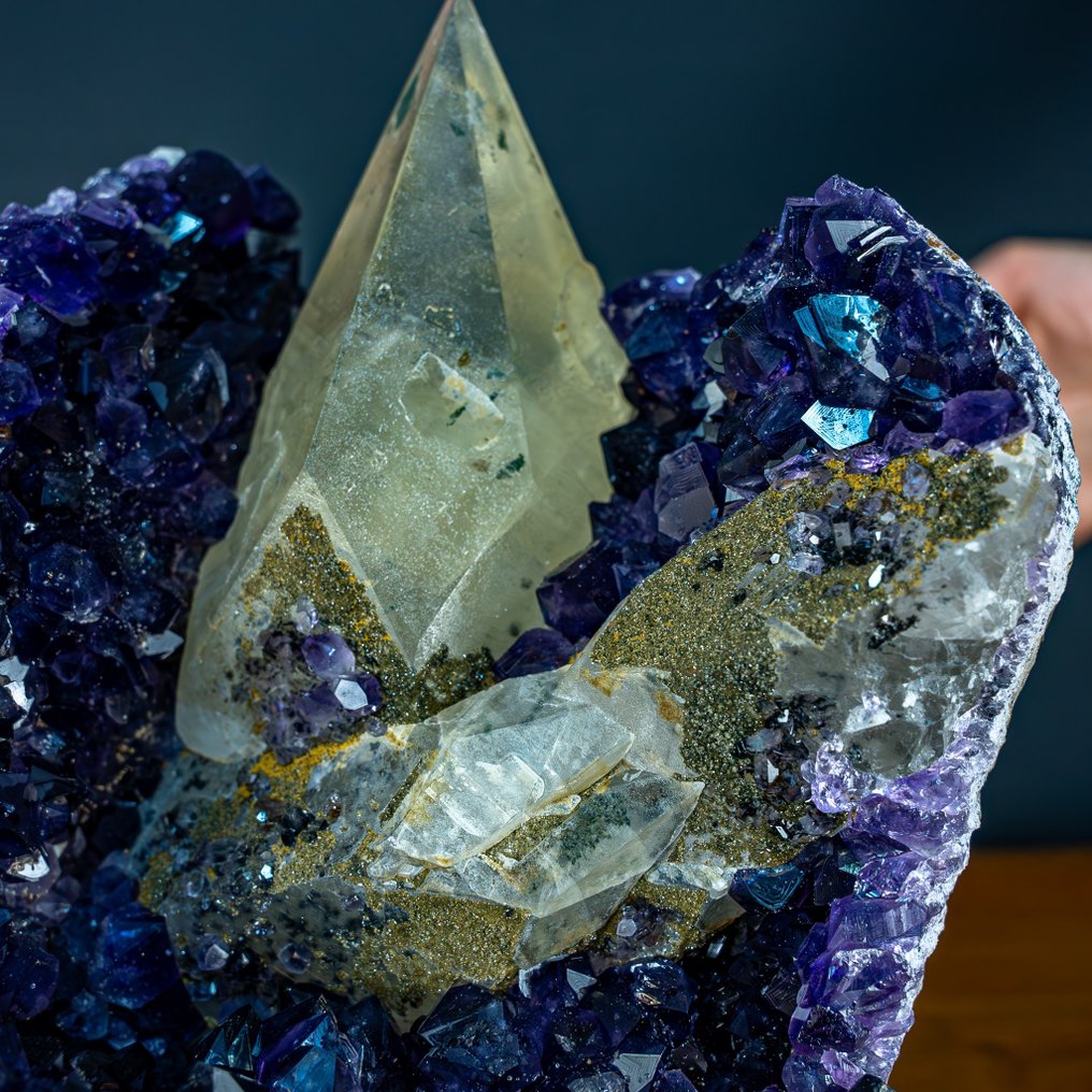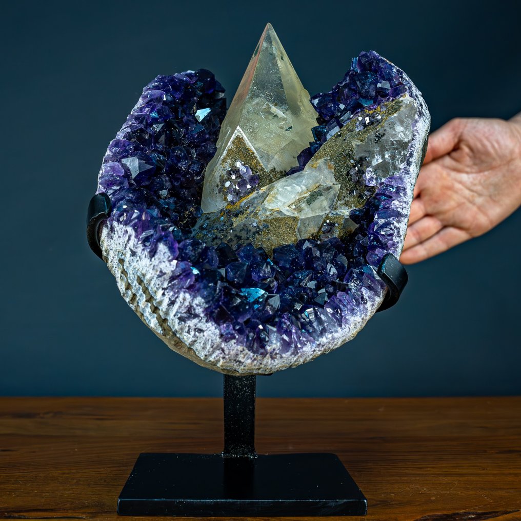 Die glänzenden und farbenprächtigen Steine sind auf den ersten Blick erkennbar und auf dem Mineralienmarkt keine Seltenheit. Bestimmte Exemplare zeichnen sich dadurch aus, dass sie über mehrere Generationen hinweg in wunderschön kristallisierten, ungewöhnlichen Formationen wachsen, wie dieses skulpturale Beispiel. Dieses Exemplar weist eine komplexe Kombination aus drei verschiedenen Mineralienarten auf. Seine Matrix (Wirtsgestein) besteht aus dicht kristallisierten, glänzenden, tiefvioletten Amethyst-kristallen, aus denen sich eine vertikale, abstrakte Formation aus gestapelten Calcit-kristallen gebildet hat. Viele sagen, dass der Kalzit einem König ähnelt, mit einer spitzen Krone. Er schwingt einen beeindruckend großen, durchdringenden Kristall, der wie ein Schwert geformt ist (eine Verlängerung des Kalzits). Die "Klinge" ist mit schimmernden, Gelb-Schwarzen Goethitkristallen überzogen, die einen dramatischen Kontrast zum Rest des Stücks bilden. Diese erstaunliche Komposition wirkt auf viele wie ein König, der mit gezücktem Schwert in die Schlacht segelt. Dieses maßstabsgetreue, interpretationsfähige und wunderschön geformte Exemplar ist ein Kunstwerk der Natur.