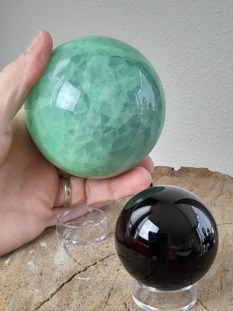De andere bol is gemaakt van zwarte Toermalijn en afkomstig uit Madagaskar (diameter 5 cm).