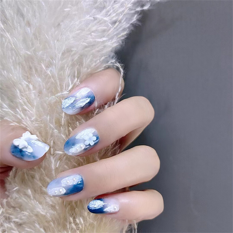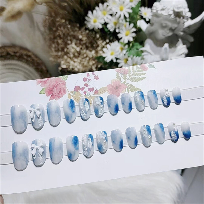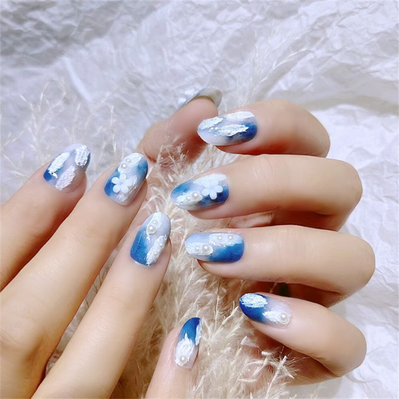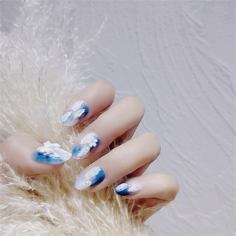 Blooming Blue Pearl False Nail Medium Almond Press on Nails for Nails Art 24pcs