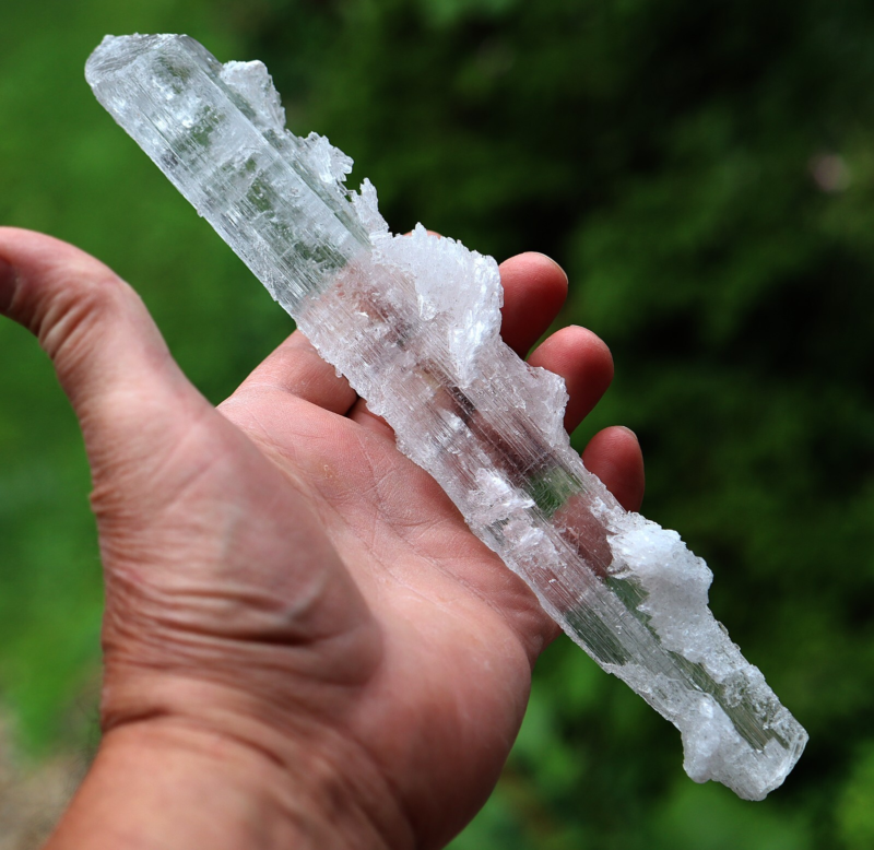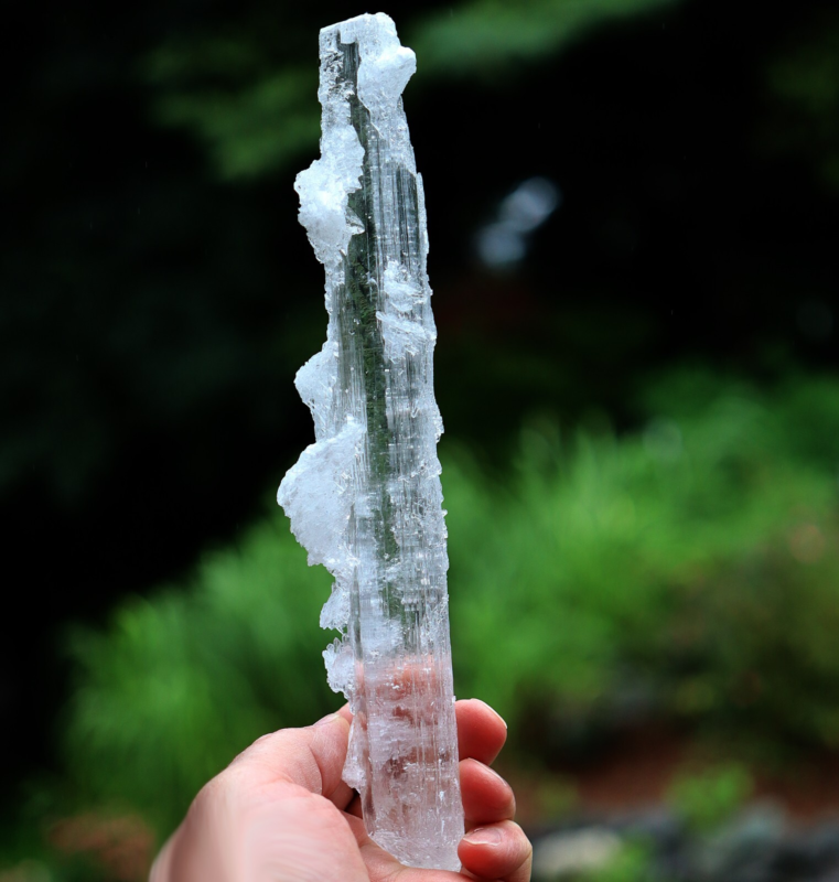 Offering a long Doubly terminated Gypsum var. Selenite floater. The crystal is pristine with lots of surface character and side flowers. Mined at Lily Mine, Humay District, Pisco Province, Ica, Peru. 24 cm. long. Cool natural complete crystal.