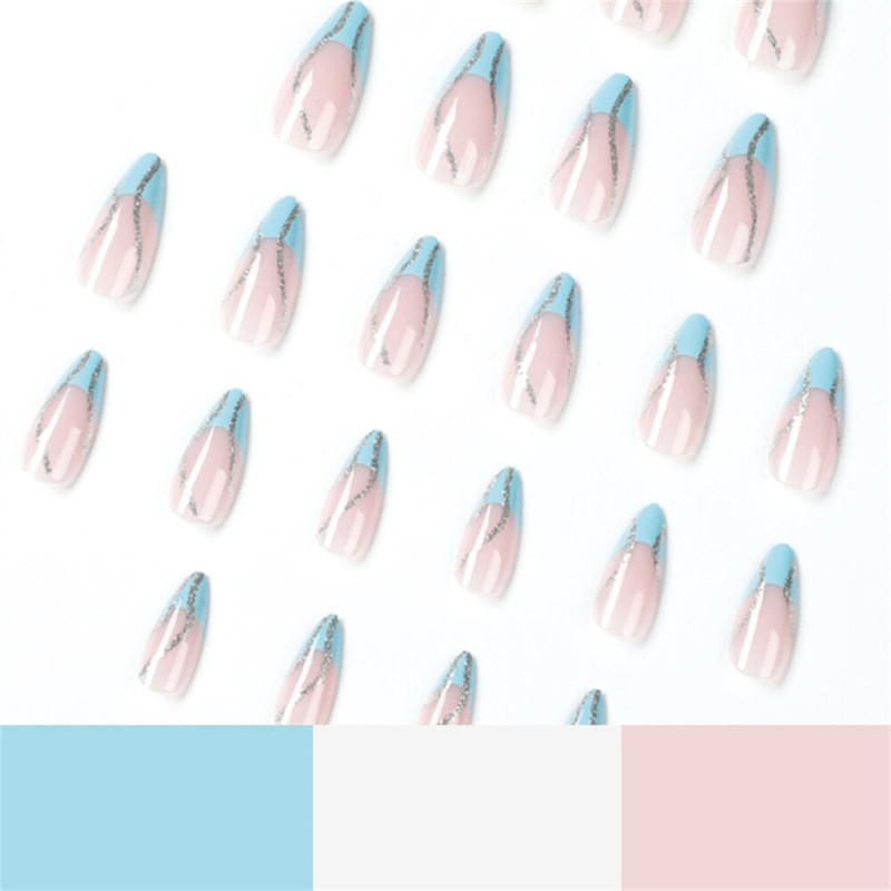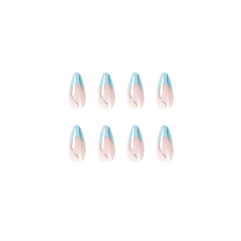 Glitter Waves Blue False Nail Short Almond Press on Nails for Nails Art 24pcs