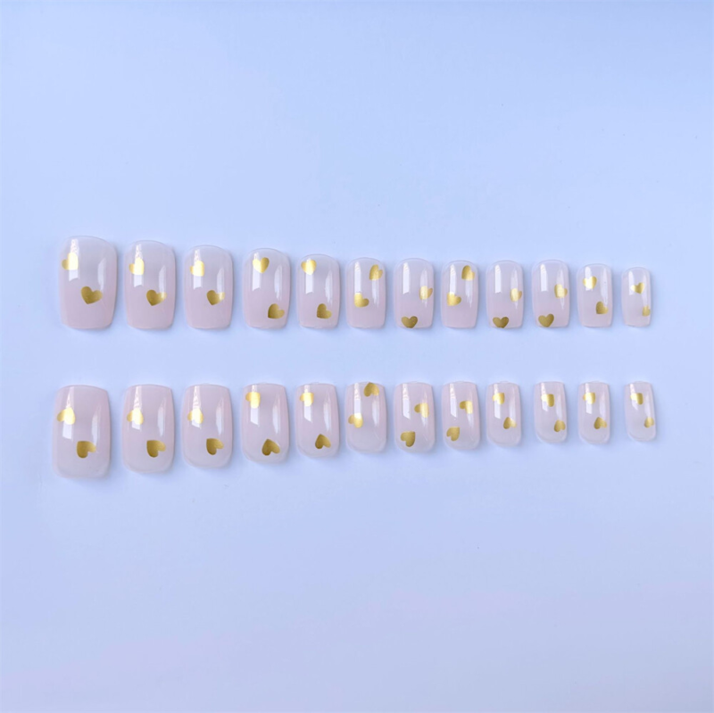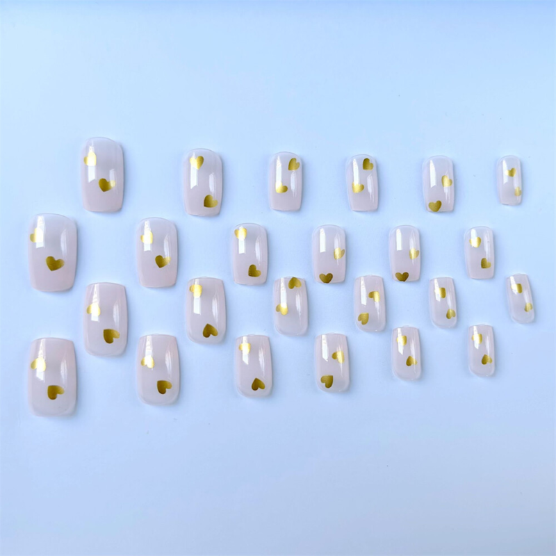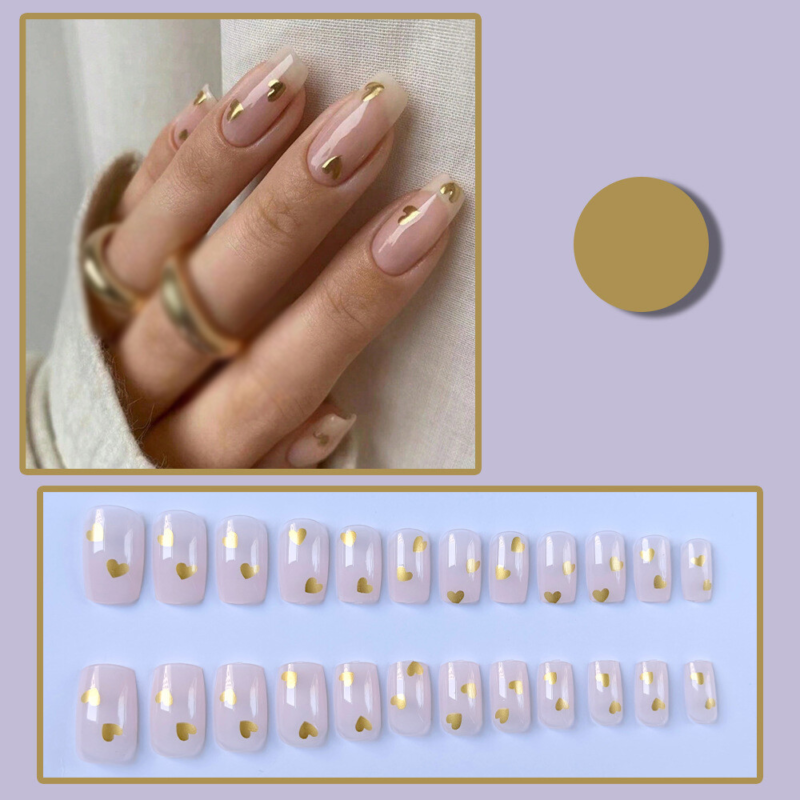 Gold Heart False Nail Nude Color Medium Square Press on Nails for Nail Art 24pcs