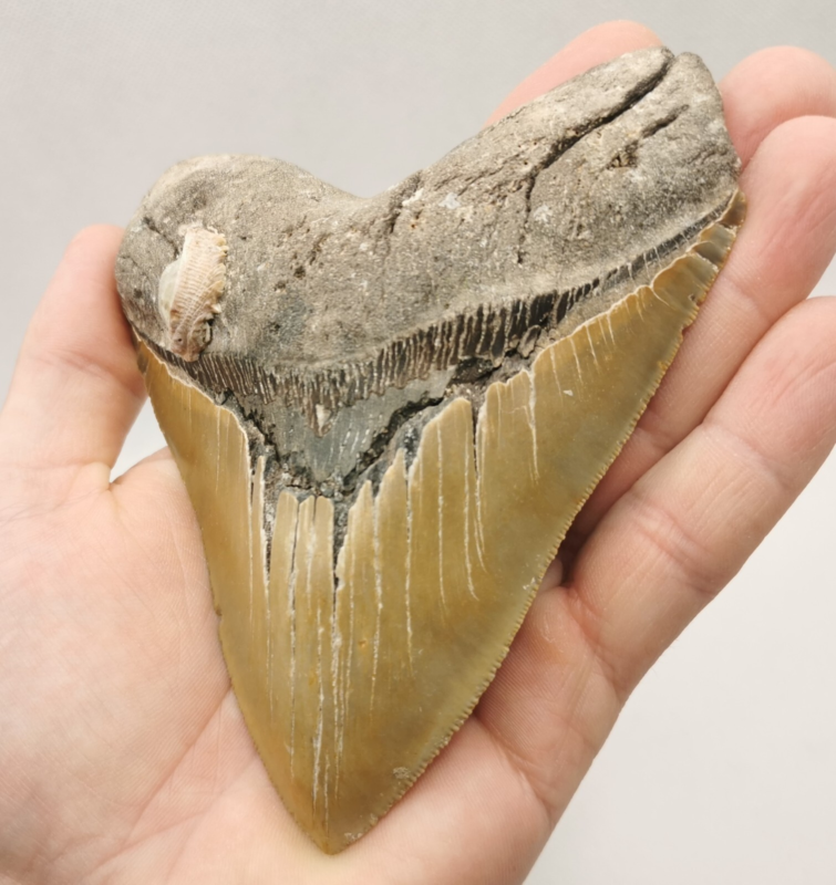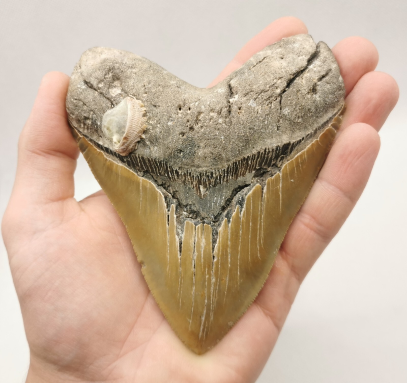 Big and beautiful megalodon shark tooth with shell! Shark Tooth Fossil USA 19
