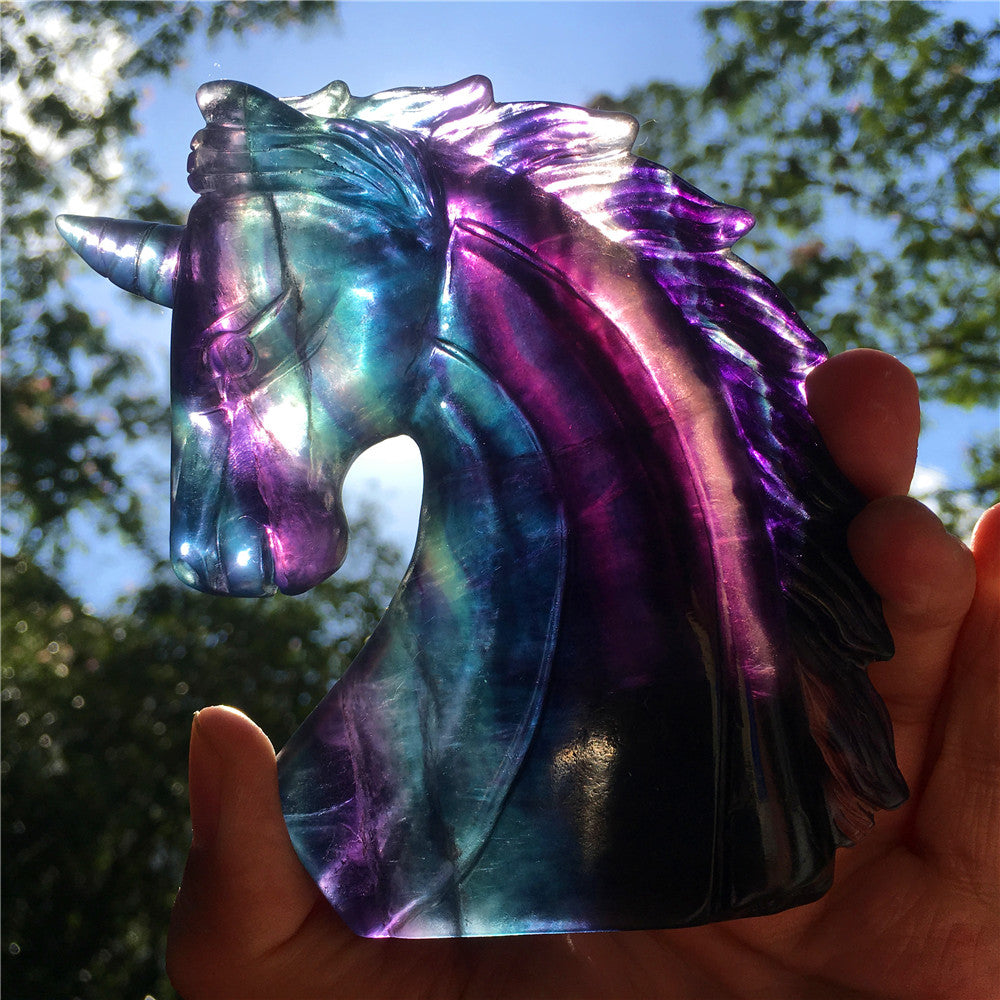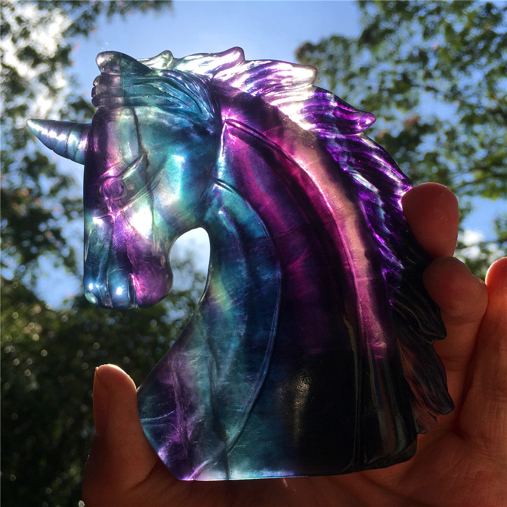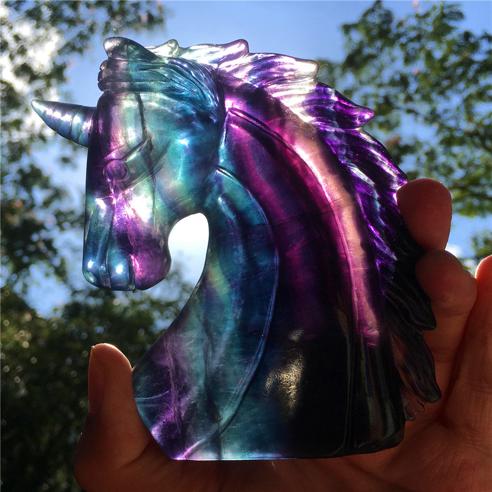 High quality natural rainbow hand carved unicorn fluorite quartz