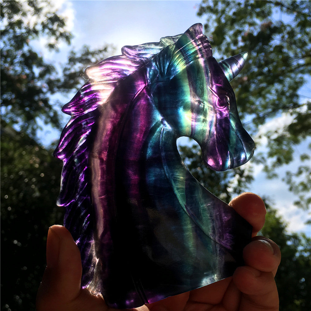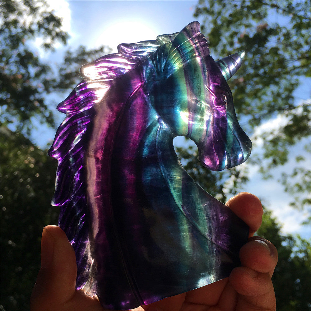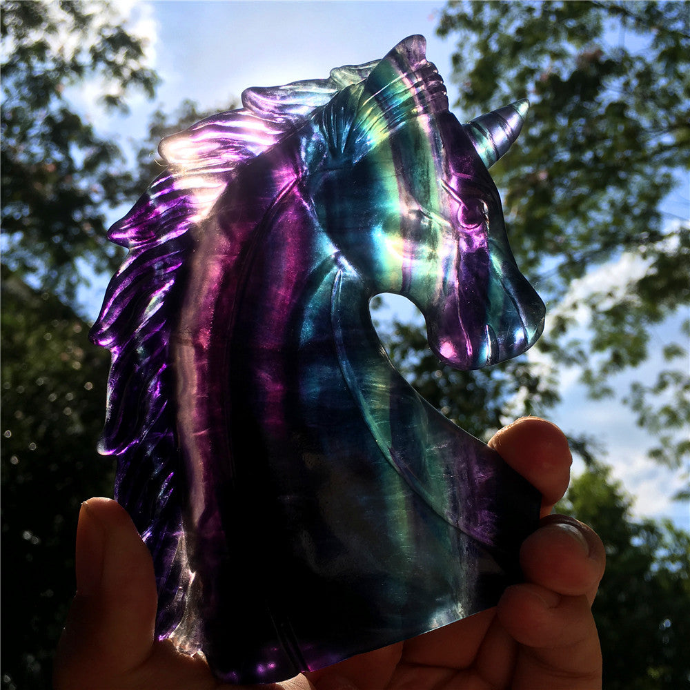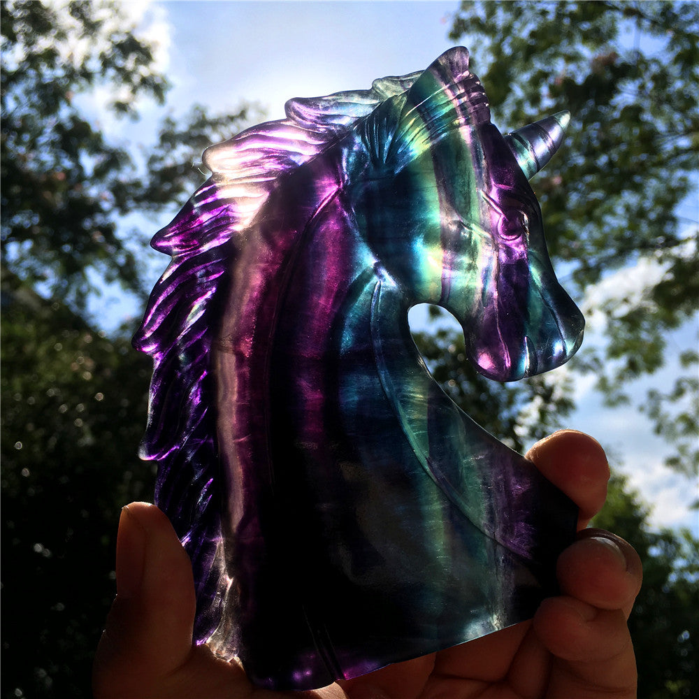 High quality natural rainbow hand carved unicorn fluorite quartz