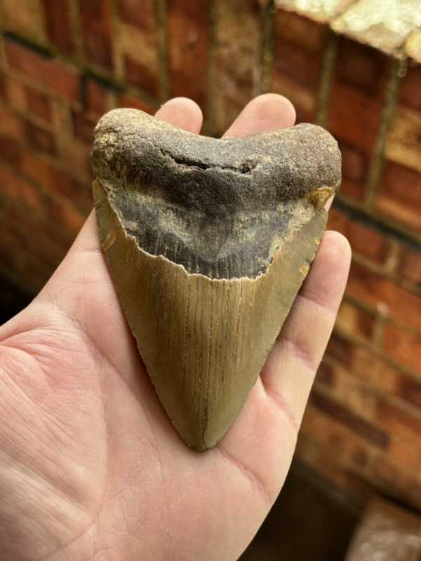 For sale is a beautiful Megalodon tooth from North Carolina, USA. The tooth measures 4.75 inches in length. There is some minor feeding damage on the enamel, but still a high quality large museum quality tooth.