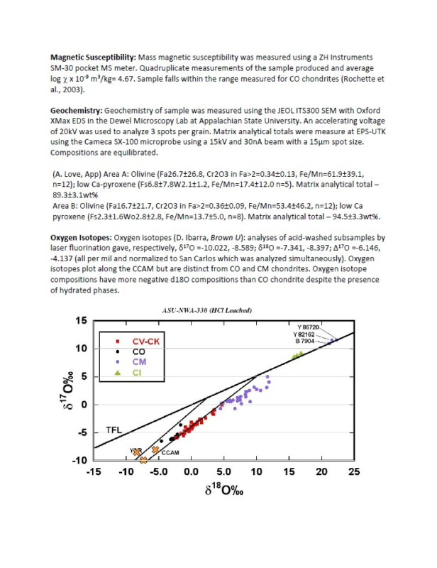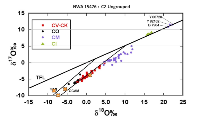 isotopes plot along the CCAM but are distinct from CO and CM chondrites. Oxygen isotope