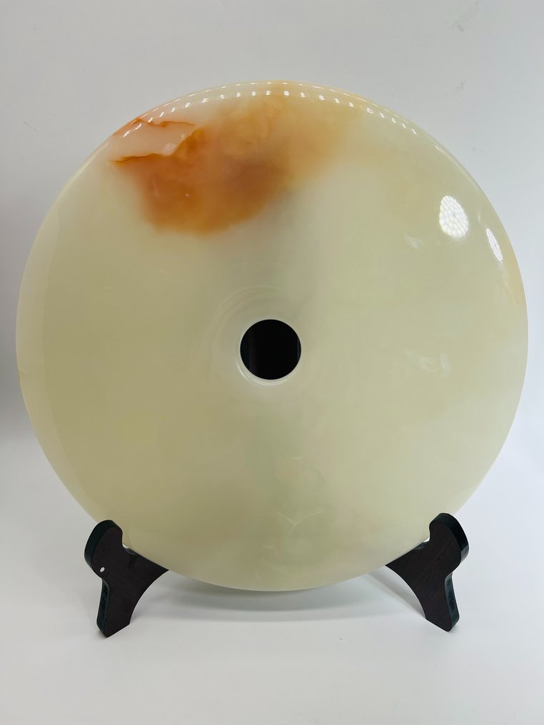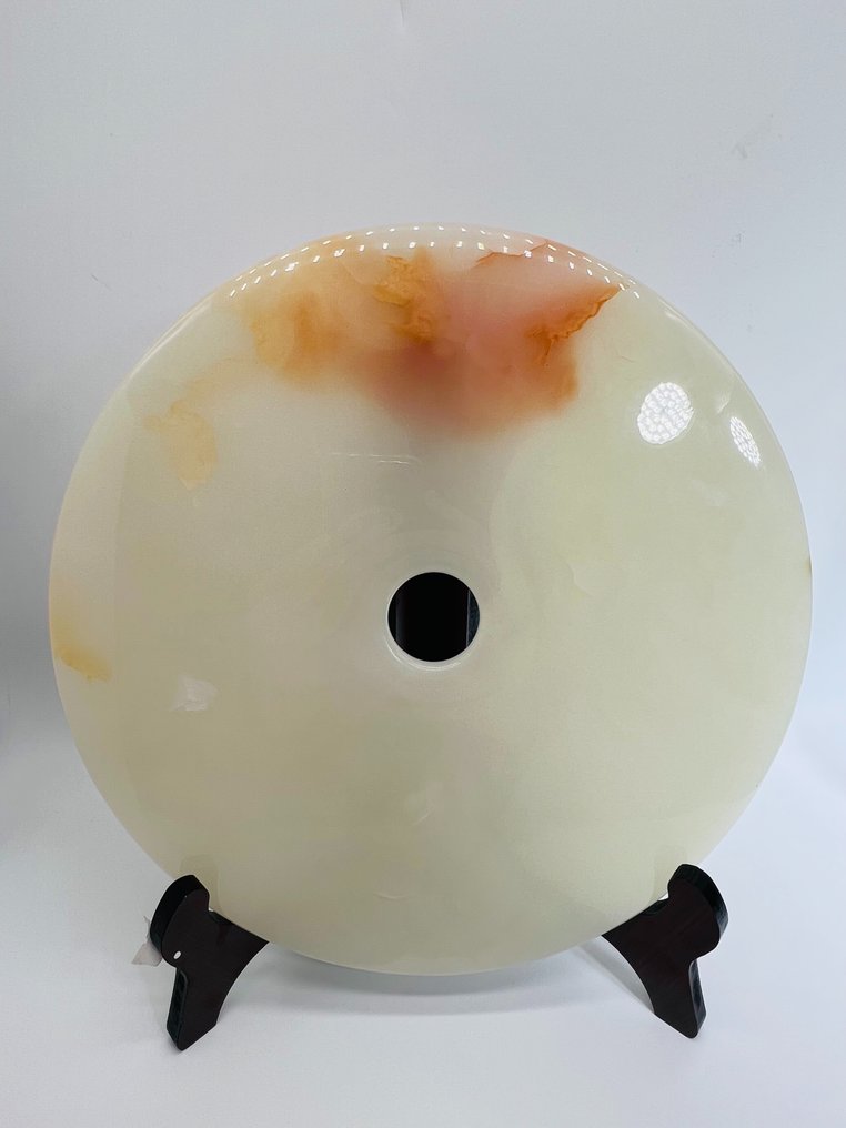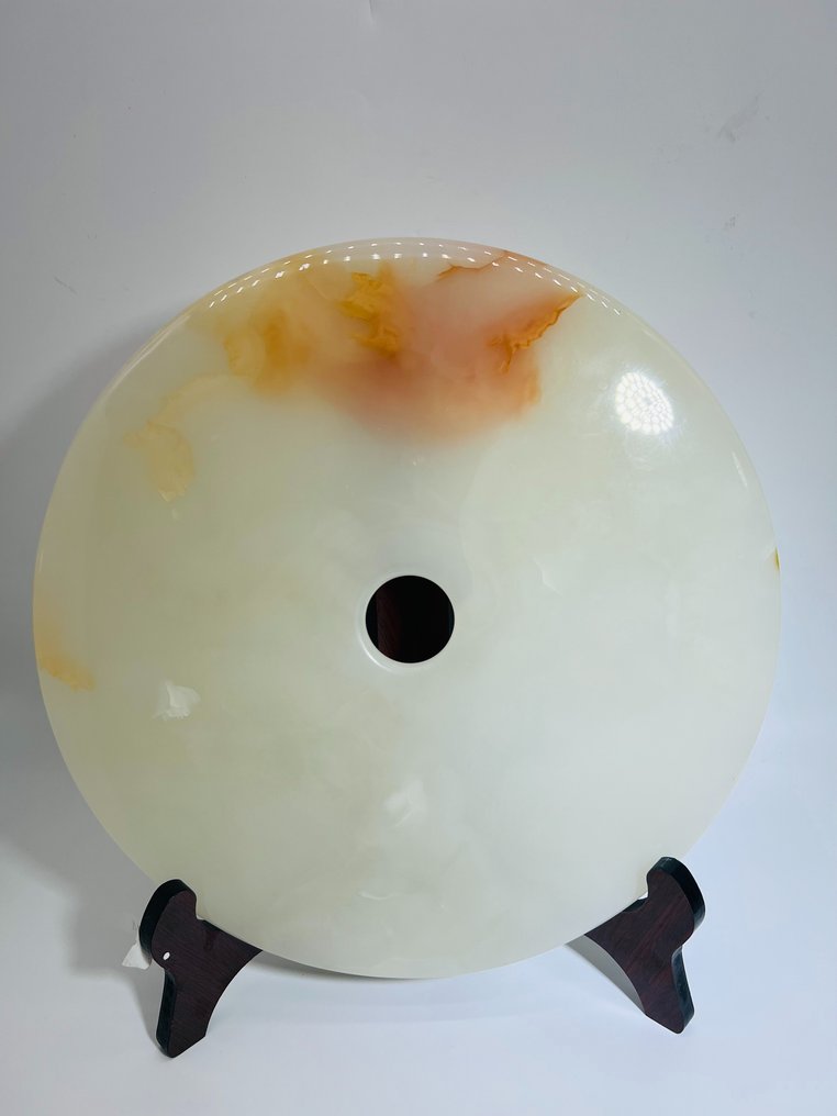 A beautiful onyx disc/donut with a diameter of 30cm and a thickness of 1.5cm. This perfect decorative object features fiery red accents.