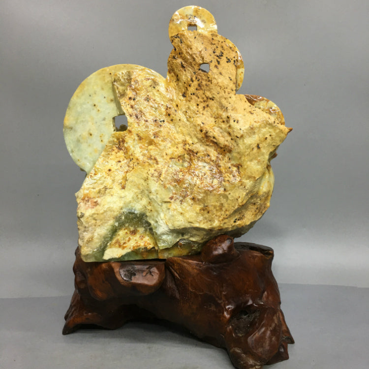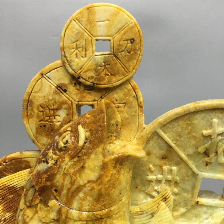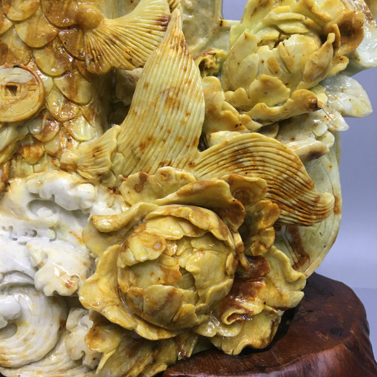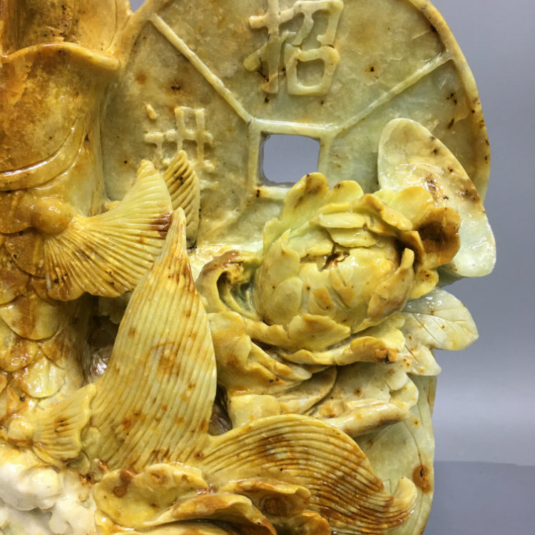 [name] abundance [color] yellow [material] Xiuyu a whole jade [carving subject] carp peony flower [size] net height 38 cm, net width 33 cm, net thickness 20 cm plus base 50 cm, about 15000g