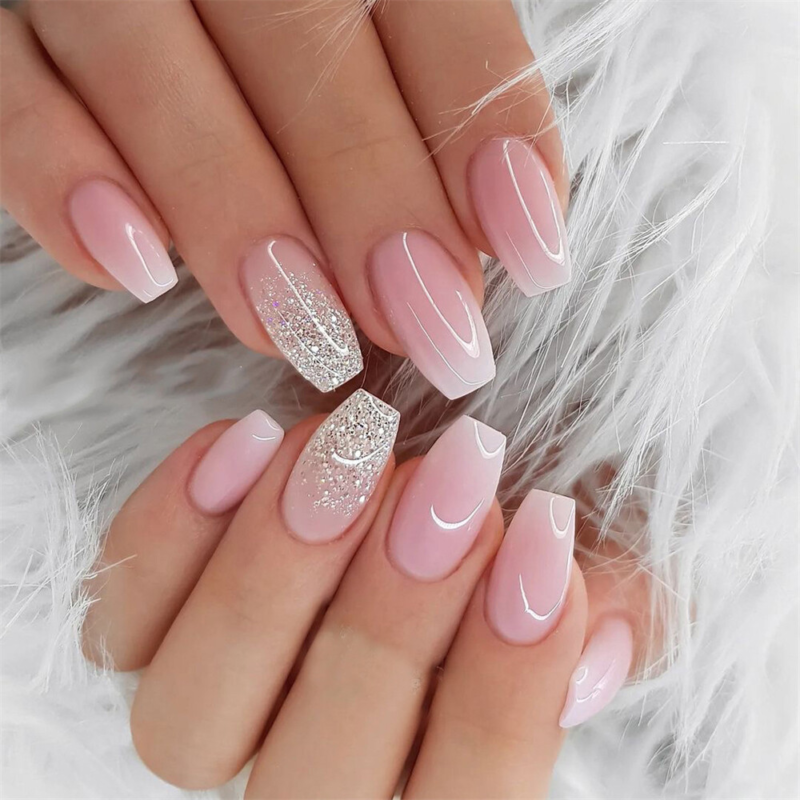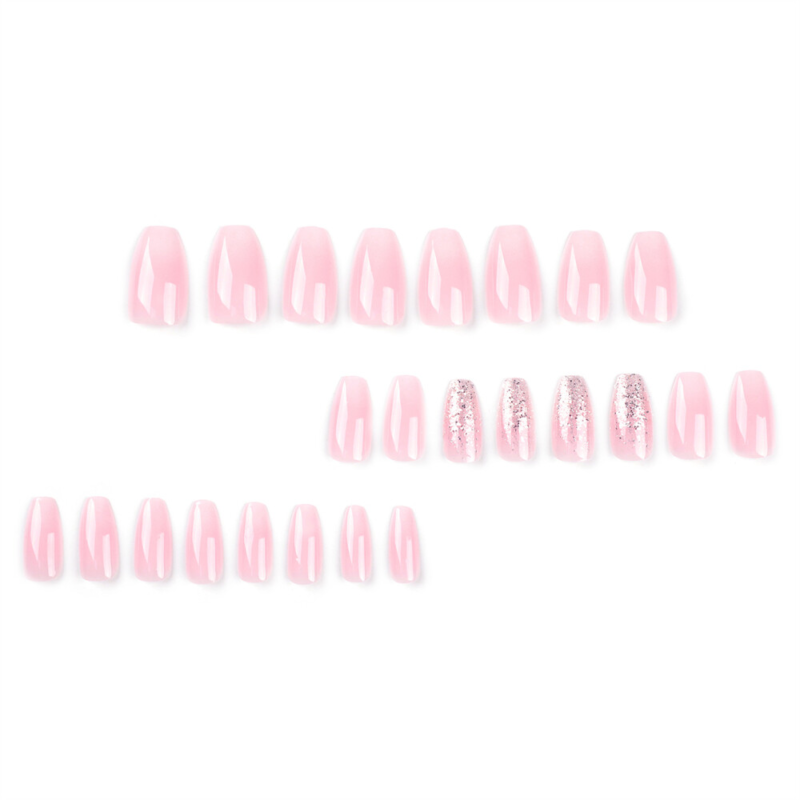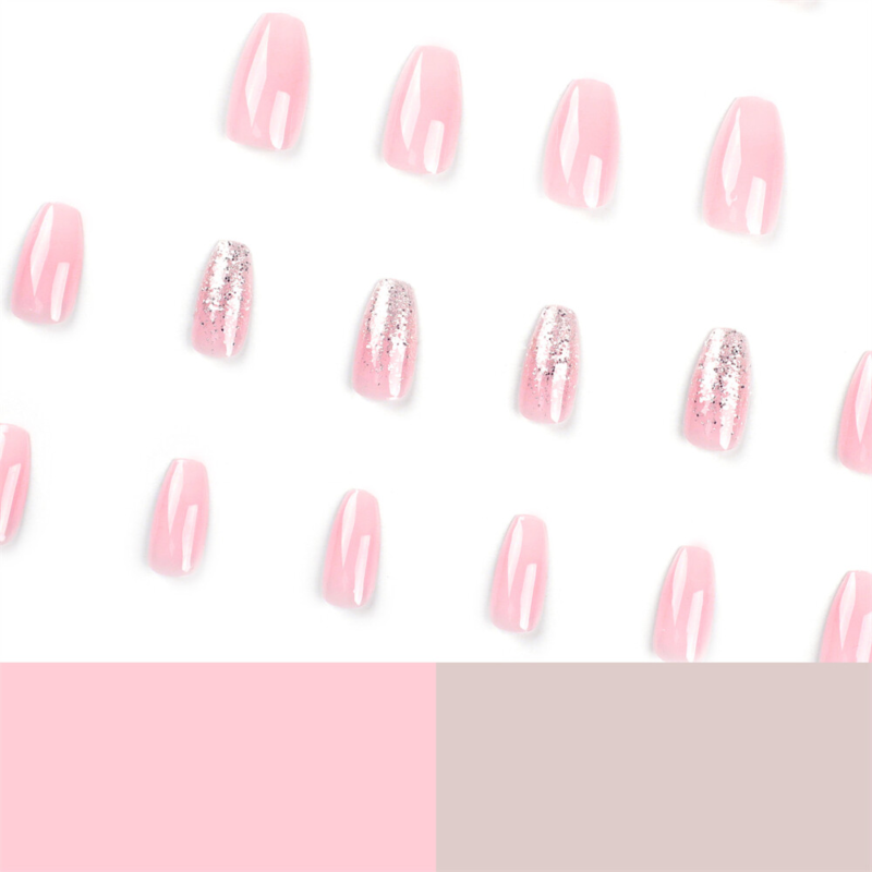 Pink Color Glitter False Nail Short Coffin Press on Nails for Nail Art 24pcs